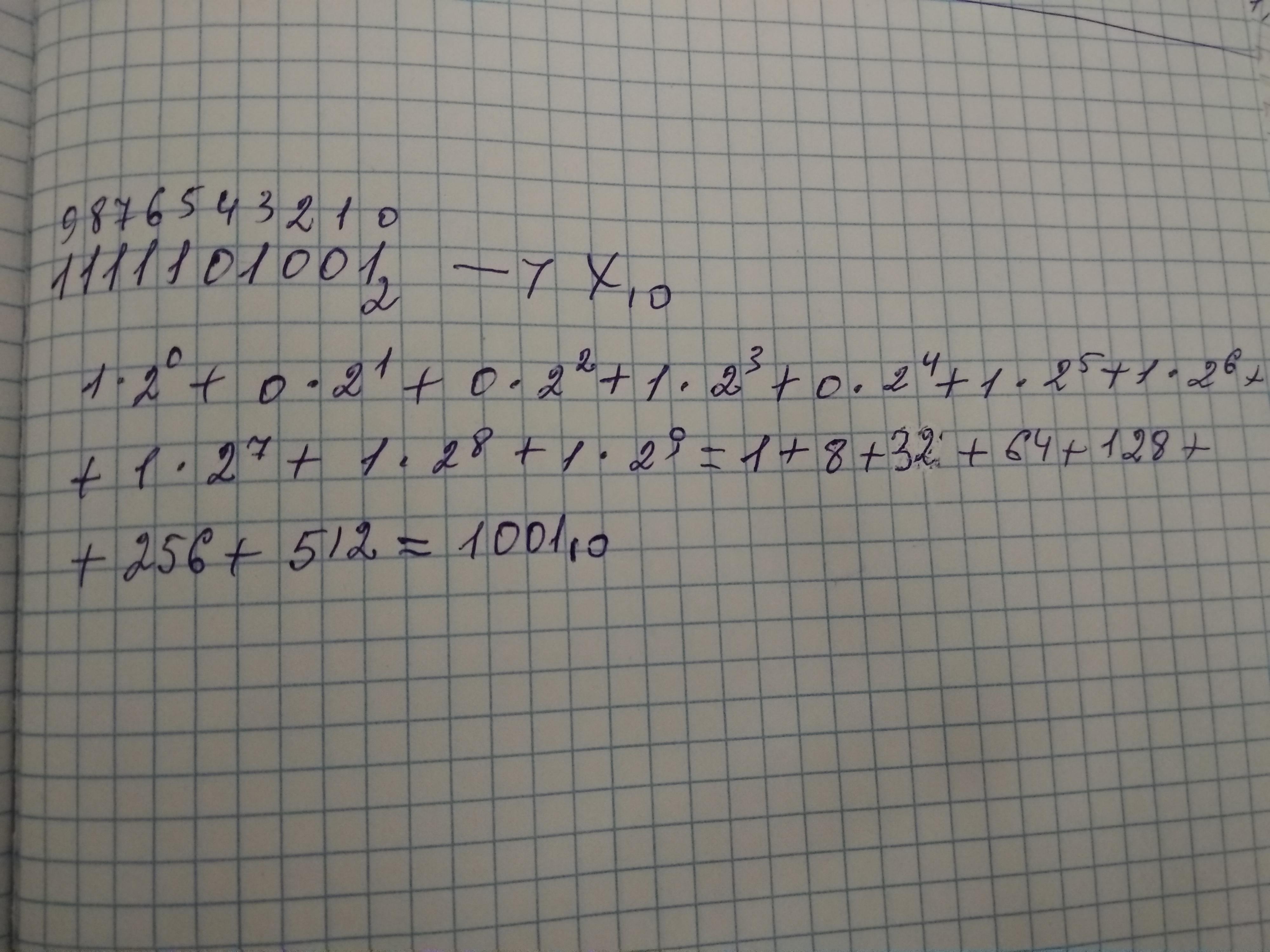 1·2^9+1·2^8+1·2^7+1·2^6+1·2^5+0·2^4+1·2^3+0·2^2+0·2^1+2^0·1 = 1001