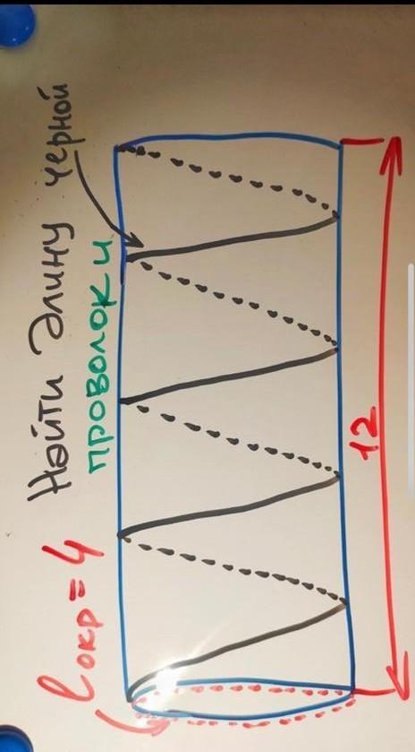 Чтобы найти длину всей проволоки, достаточно найти длину одного такого косого отрезка. Она находится как длина гипотенузы треугольника со сторонами 4 и 3 (12:4) сантиметра, и равна пяти. Четырежды пять — двадцать (сантиметров); это и есть длина проволоки.