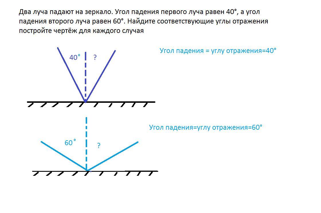 падения второго луча равен 60°. Найдите соответствующие углы отражения