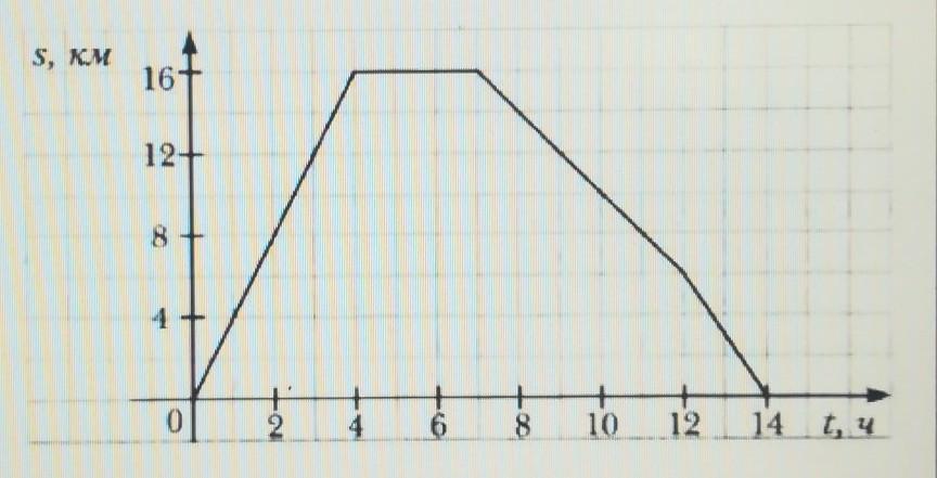 4) Первые 4 часа турист шел со скоростью 4 км/ч (За 4 ч он прошел с постоянной скоростью 16 км. Определяем время 16:4=4 (км/ч))