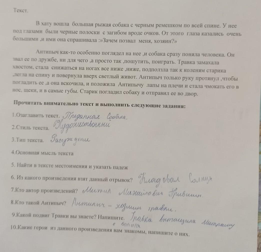 Тип текста скорее повествование, основная мысль -дружба животного и человека, местоимения - у нее (р.п), он (и.п), она (и.п), его (р.п)