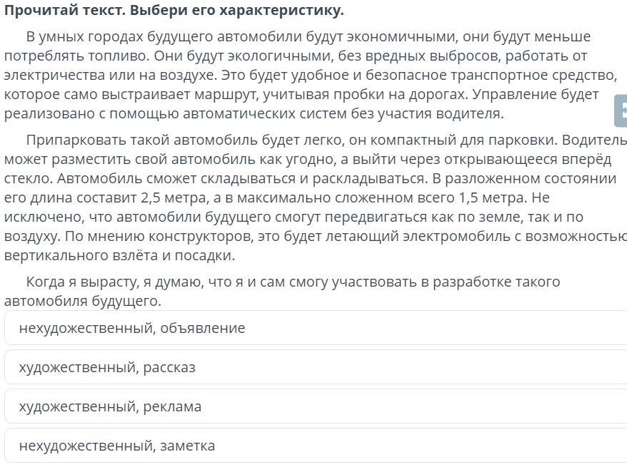 Прочитай текст. Выбери его характеристику. в умных городах будущего автомобили будут экономичными, они будут меньше потреблять топливо. Они будут экологичными, без вредных выбросов, работать от электричества или на воздухе. Это будет удобное и безопасное транспортное средство которое само выстраивает маршрут, учитывая пробки на дорогах. Управление будет реализовано с помощью автоматических систем без участия водителя. Припарковать такой автомобиль будет легко, он компактный для парковки. Водите, может разместить свой автомобиль как угодно, а выйти через открывающееся вперёд стекло. Автомобиль сможет складываться и раскладываться. В разложенном состоянии его длина составит 2,5 метра, а в максимально сложенном всего 1,5 метра. Не исключено, что автомобили будущего смогут передвигаться как по земле, так и по воздуху. По мнению конструкторов, это будет летающий электромобиль с возможност вертикального взлёта и посадки. Когда я вырасту, я думаю, что я и сам смогу участвовать в разработке такого автомобиля будущего. нехудожественный, объявление художественный, рассказ художественный, реклама нехуложестренный заметка
