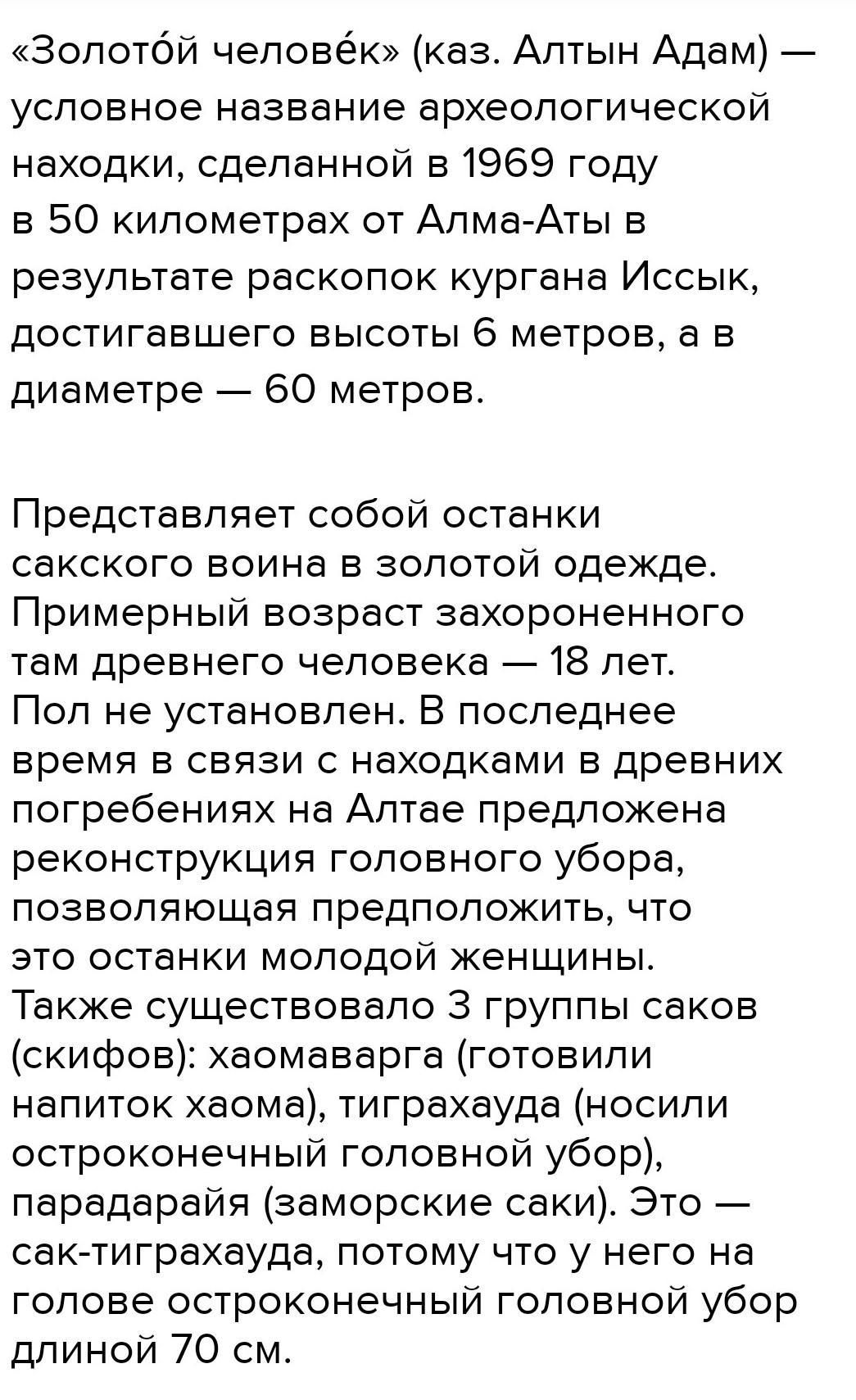 «Иссыкский золотой человек» был найден в 1969 году в Казахстане. Археологи проводили раскопки кургана Иссык, расположенного на берегу одноимённой реки, и обнаружили там останки сакского воина в золотой одежде. Его голову украшала длинная остроконечная шапка.