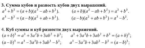 - Сумма кубов: a³+b³=(a+b)(a²-ab+b²)