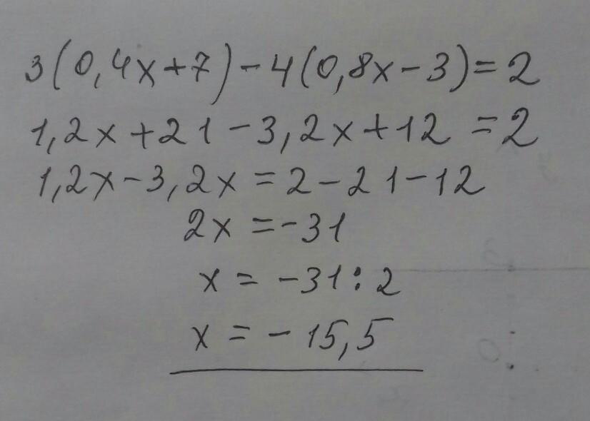 3 *(0,4 x + 7) - 4 *(0,8 x - 3)=2