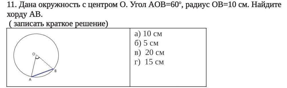 Дана окружность с центром О. Угол AOB=60о, радиус OB=10 см. Найдите хорду AB.