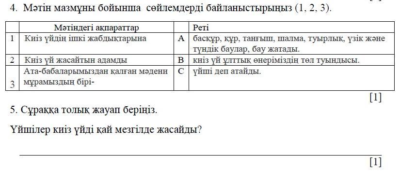 1-2) Негізгі: Ата бабаларымыздан қалған мәдени мұрамыздың бірі киіз үй ұлттық өнеріміздің ағаш жабдығы үйдің сүйегі деп аталады.