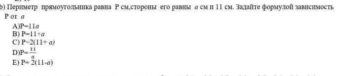 b) Периметр прямоугольника равна Р см,стороны его равны а см и 11 см. Задайте формулой зависимость POT a A)P= prod Ia B) p = 11 + a C) P = 2(11 + a) D)P= E) P = 2(11 - a)