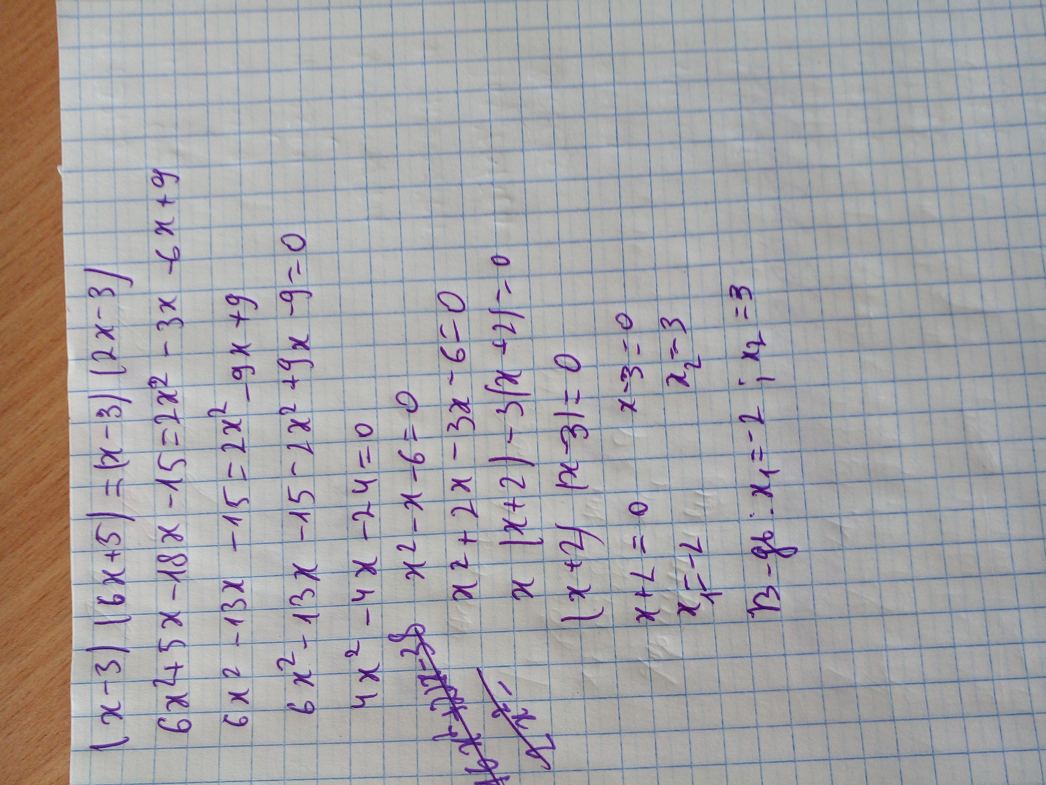 смотри я тебе в комментариях решила. Последний пример (х-3)(6х+5)=(х-3)(2х-3) (х-3) и левой и правой частях сократи и получится 6х+5=2х-3 6х-2х= - 3-5 4х= - 8. х= - 2