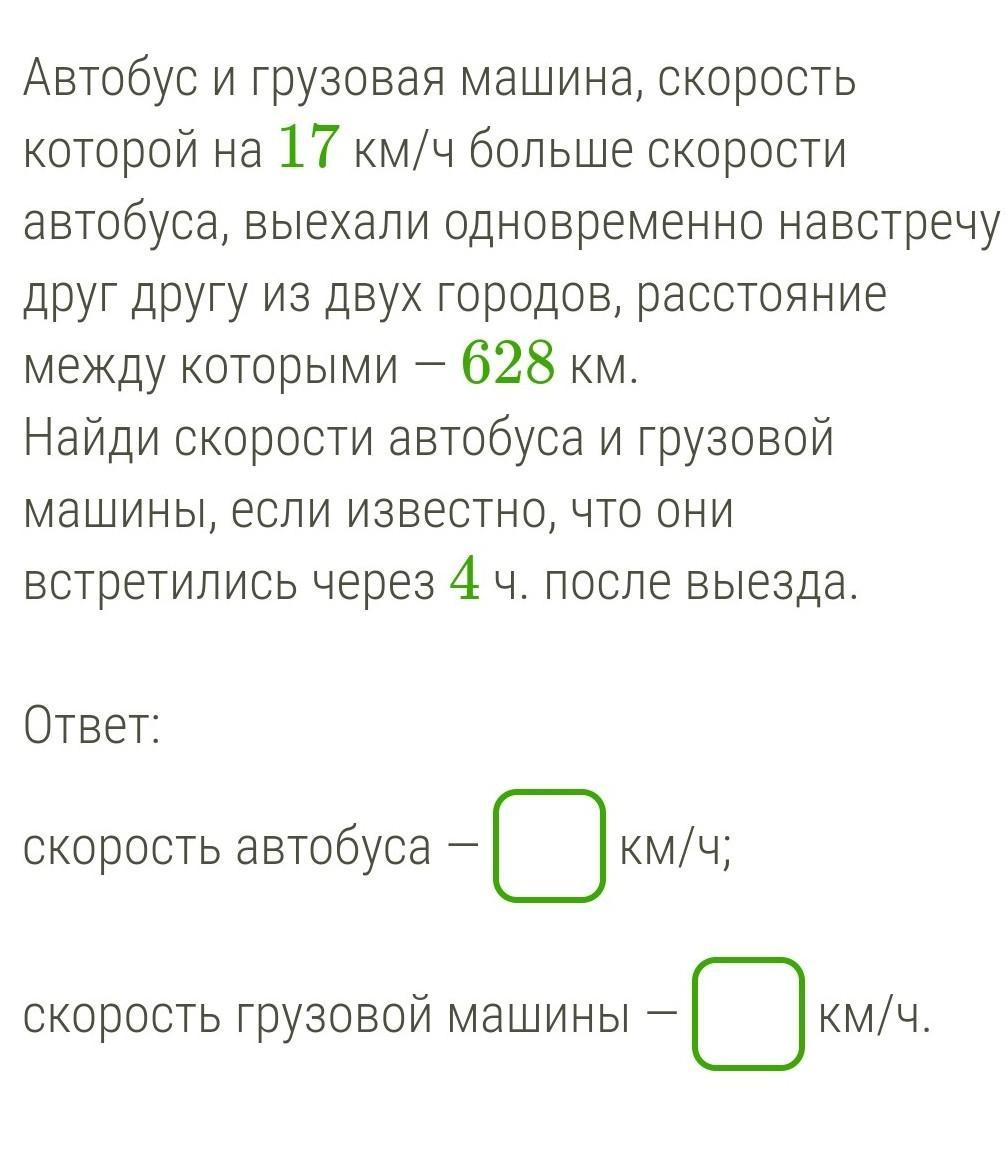 Ответ: 70 и 87 (км/ч) соответственно скорости автобуса и машины.