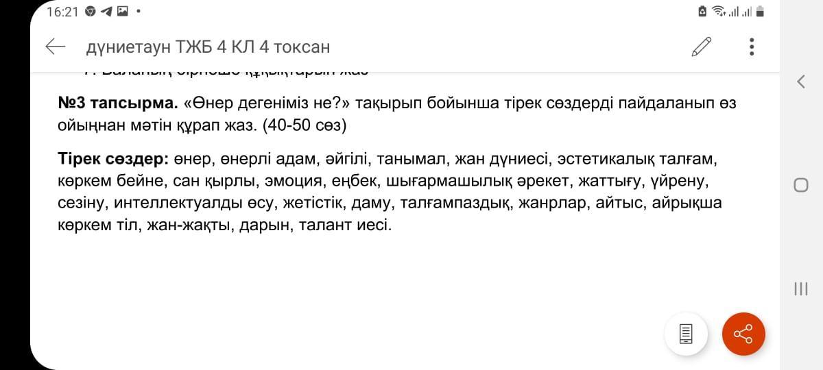 «Өнер дегеніміз не?» тақырып бойынша тірек сөздерді пайдаланып өз ойыңнан мәтін құрап жаз. (40-50 сөз)