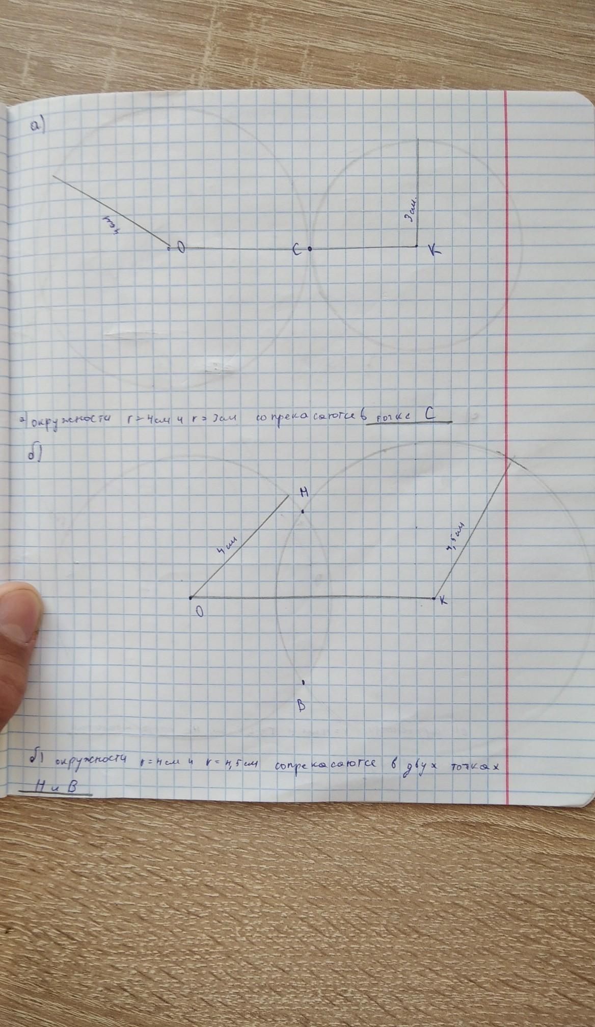 4. Начертите окружность радиуса 4 см, c центром О. Проведите луч с началом в точке О и отметьте на нем точку K, удаленную от точки О на 7см. Проведите окружность с центром в точке В, радиус которой: a)3 см; b)4cм 5мм; c)2см 5мм