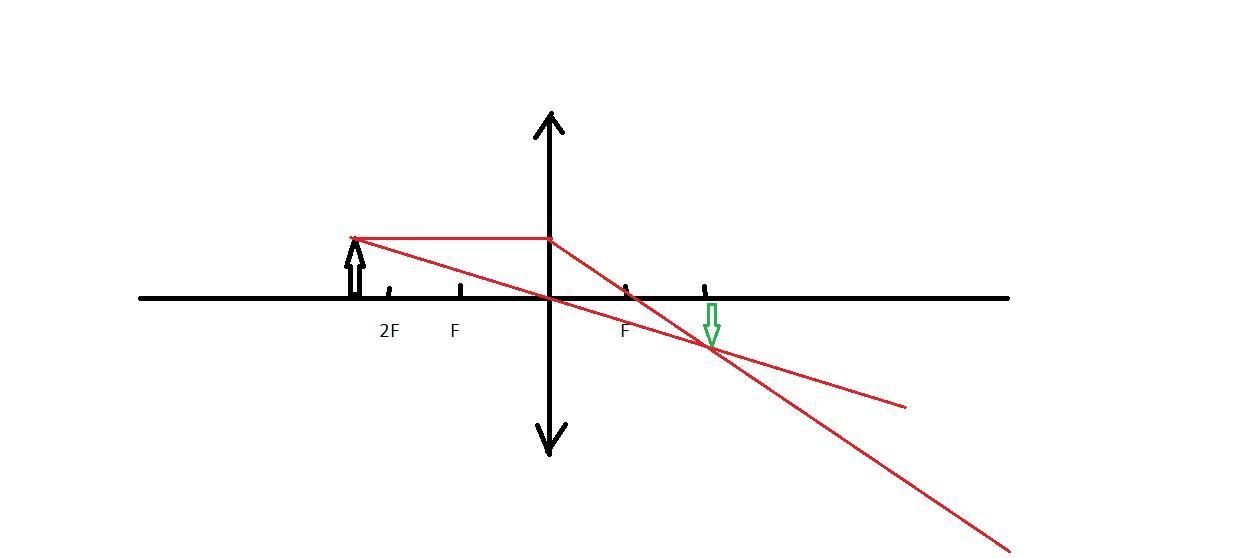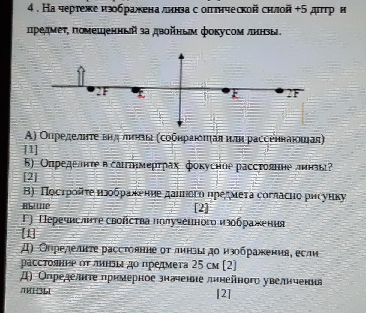 На чертеже изображена линза с оптической силой +5 дптр предмет, помещенный за двойным фокусом линзы.