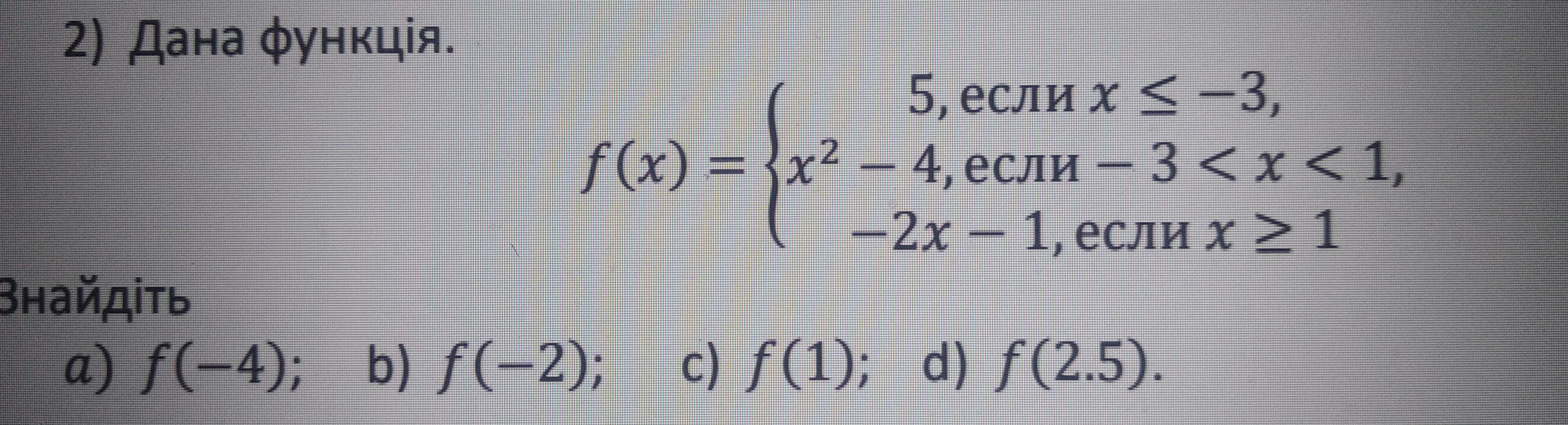 смотри, то, что написано в скобках f(x) - это х. Ты смотришь на свою функцию, куда этот х попадает. У тебя три промежутка х<=3 или -3<x<1 или х>=1 и подставляешь значение этой функции. Например, х=0, попадает в промежуток -3<x<1. Функция на этом промежутке f(x)=x^2-4. Подставляем х=0 в f(x)=x^2-4, получаем 0^2-4=-4. Можешь проверить все значения остальные.
