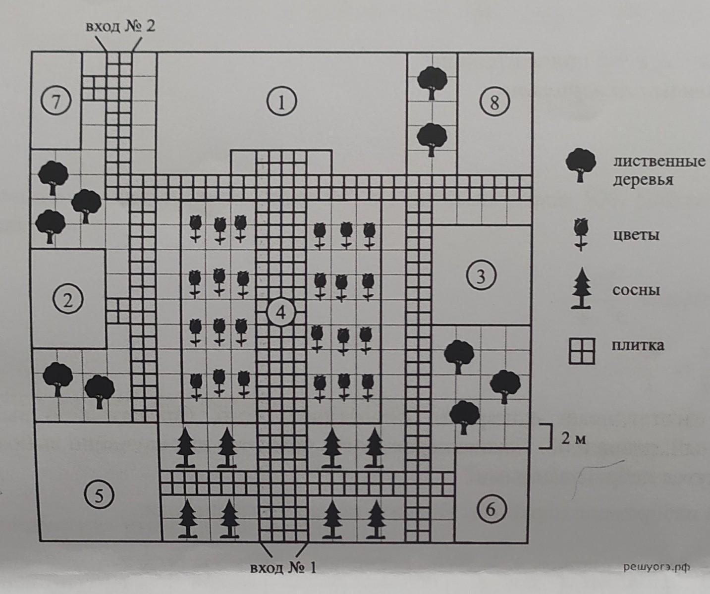 Насколько я смог подсчитать по рисунку, таких плиток требуется 32 штуки, чтобы замостить ими прямоугольник от входа 1 до Дома Творчества.