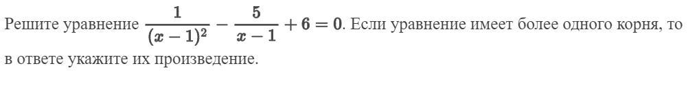 \dfrac{1}{(x-1)^{2} }-\dfrac{5}{x-1} +6=0\\\\\dfrac{1-5(x-1)+6(x^{2}-2x+1) }{(x-1)^{2} } =0\\\\\dfrac{1-5x+5+6x^{2}-12x+6 }{(x-1)^{2} } =0\\\\\dfrac{6x^{2}-17x+12 }{(x-1)^{2} }=0\\\\6x^{2}-17x+12=0 \ , \ x\neq1\\\\D=(-17)^{2}-4*6*12=289-288=1\\\\x_{1} =\frac{17+1}{12}=\frac{18}{12} =1,5\\\\x_{2} =\frac{17-1}{12} =\frac{16}{12} =1\frac{1}{3} \\\\x_{1} \cdot x_{2} =1,5\cdot 1\frac{1}{3}=\frac{3}{2} \cdot \frac{4}{3}=2\\\\\boxed{x_{1} \cdot x_{2} =2}