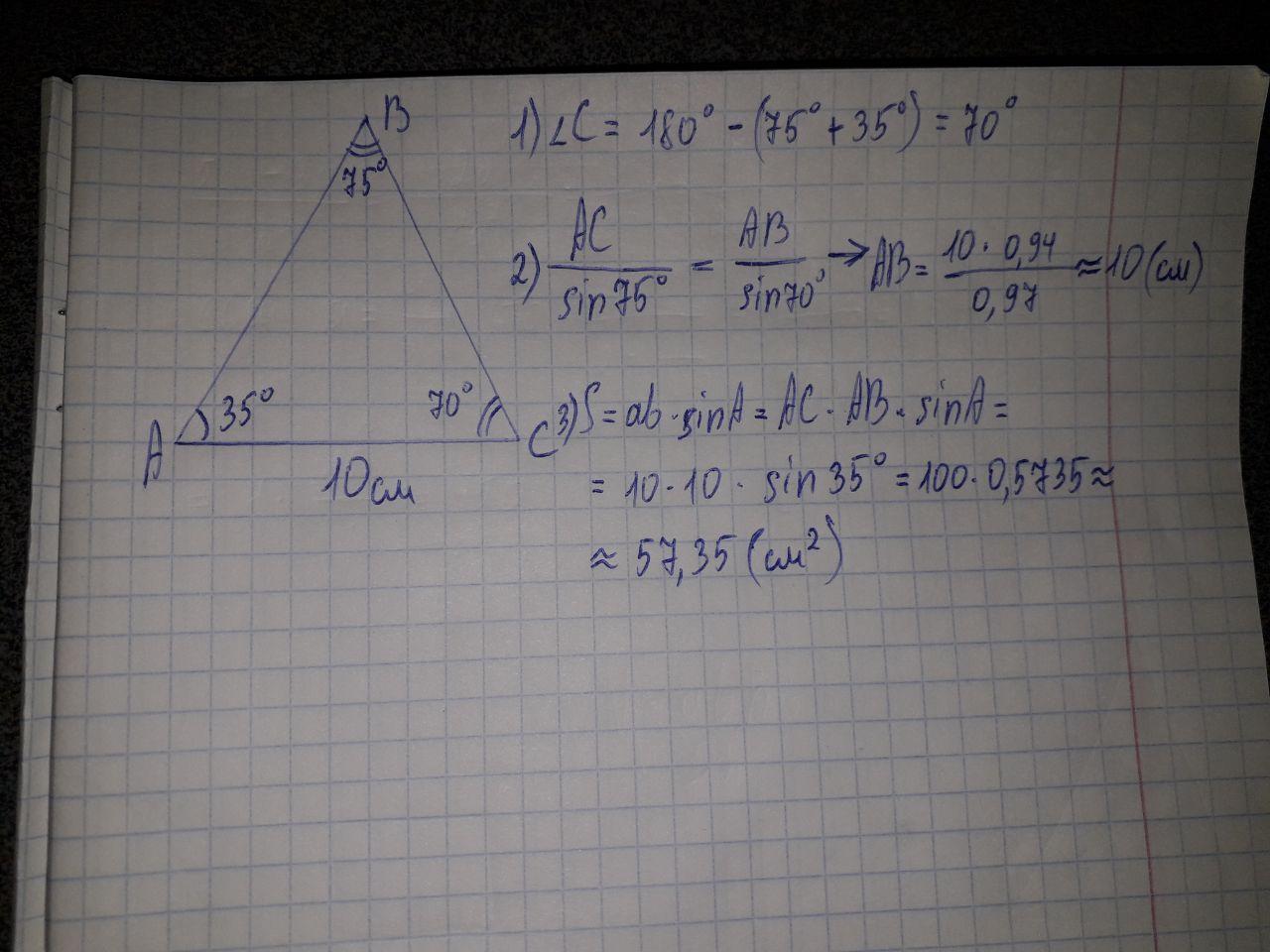 Визнач площу трикутника ABC, якщо AC = 10 см, ∠A=35°, ∠B=75°.