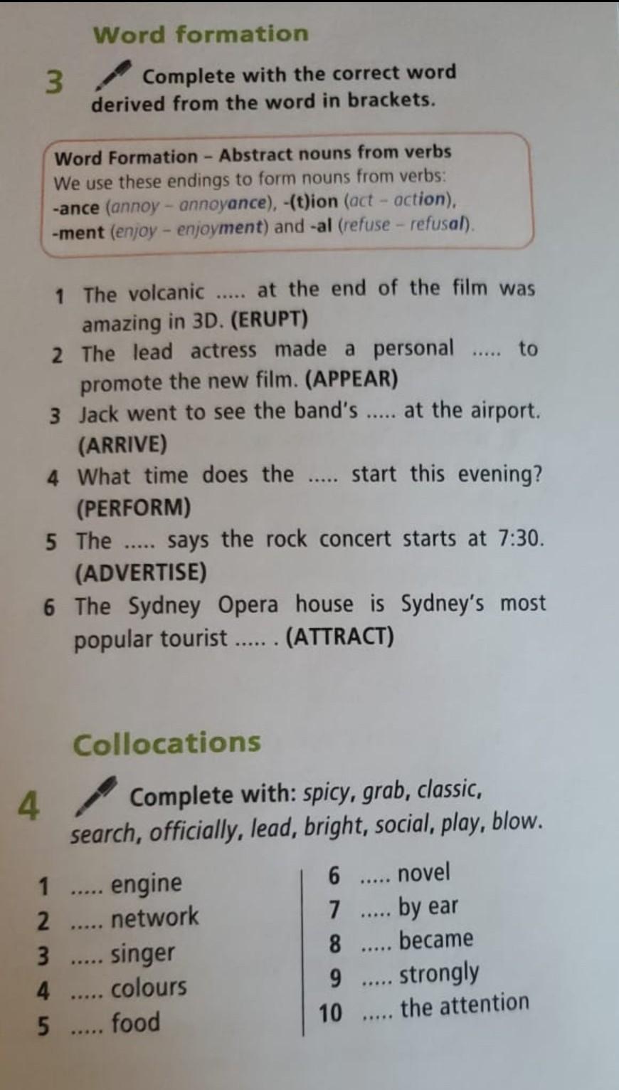 Упр 3 1. eruption 2. appearance 3. arrival 4. performance 5. advertisement 6. attraction