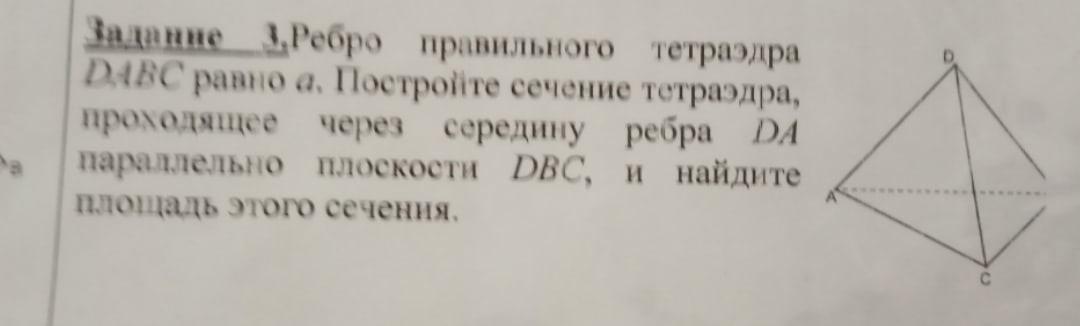 Обозначим середину ребра ДА точкой "М" и проведём сечение через МНК // ДВС, данный тетраэдр является правильным по условию, точки М, Н, К являются серединами граней тетраэдра АД, АВ, АС соответственно, => ∆МНК является правильным а его стороны - среднеми линиями правильного ∆ДВС,. => МН=НК=МК=а/2