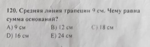 Т. к. средняя линия трапеции равна полусумме оснований, то сумма оснований = 2-м средним линиям, т. е. 9*2=18 см - это ответ С).