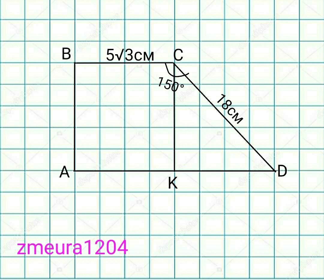 знайдіть площу прямокутної трапеції менша основа якої 5√3 см більша бічна сторона 18 см а тупий кут дорівнює 150°