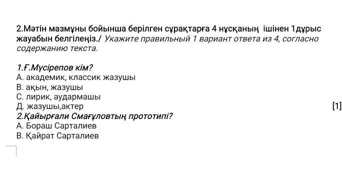 мәтін мазмұны бойынша берілген сұрақтарға 4 нұсқаның ішінен 1 дұрыс жауабын белгілеңіз