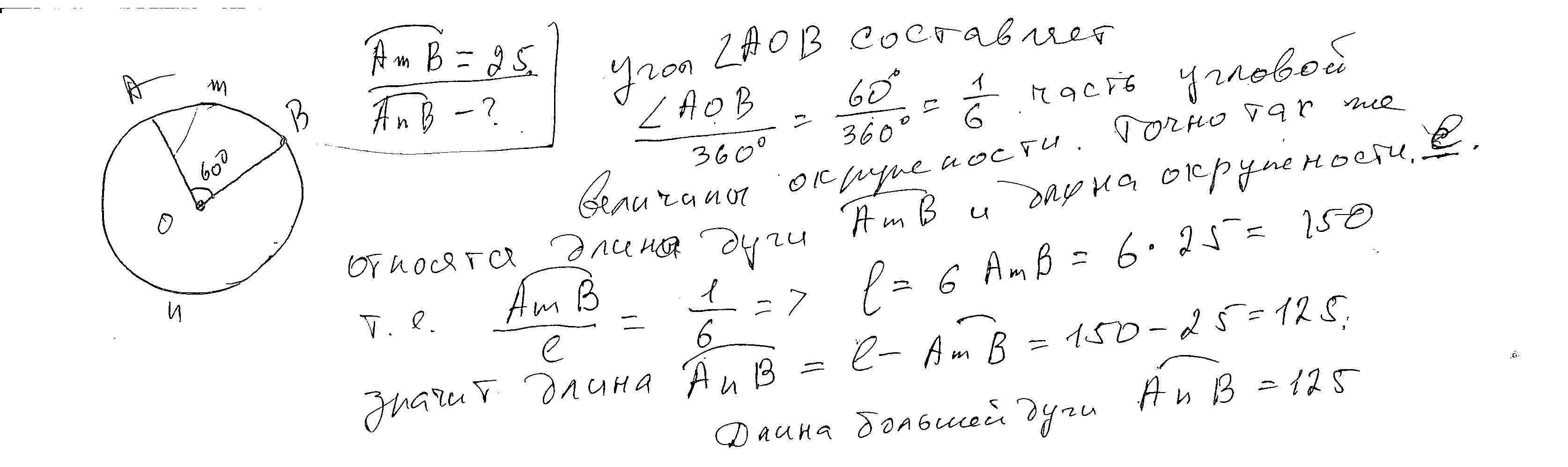 На окружности с центром О отмечены точки А и В так, что угол AOB = 60°. Длина меньшей дуги АВ равна 25. Найдите длину большей дуги
