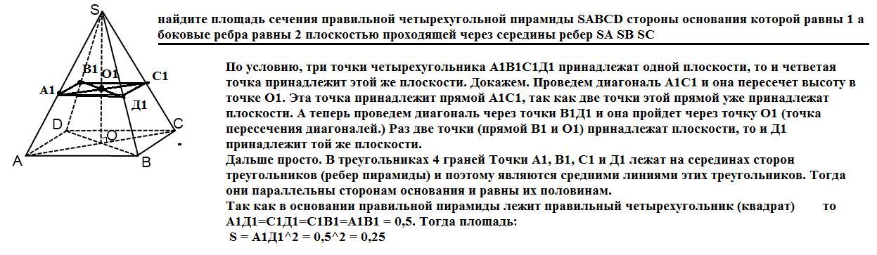 найдите площадь сечения правильной четырехугольной пирамиды SABCD стороны основания которой равны 1 а боковые ребра равны 2 плоскостью проходящей через середины ребер SA SB SC