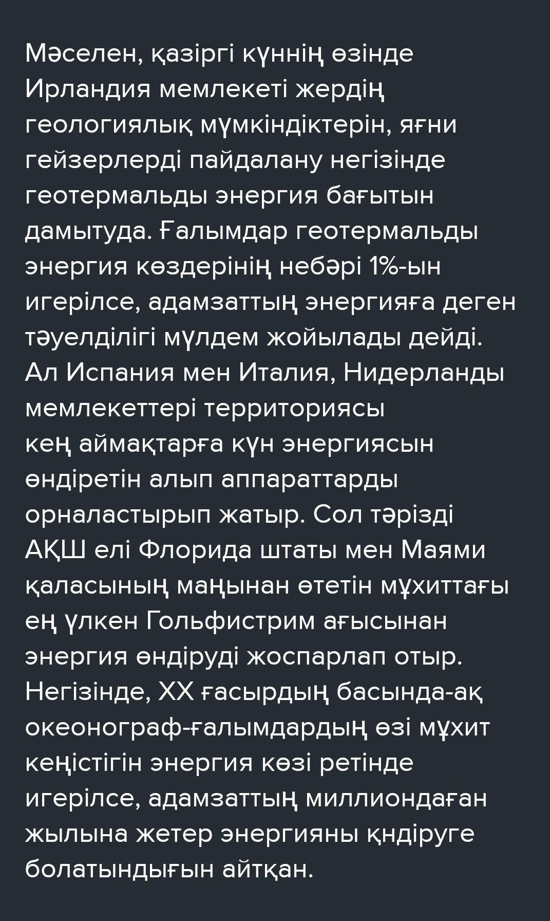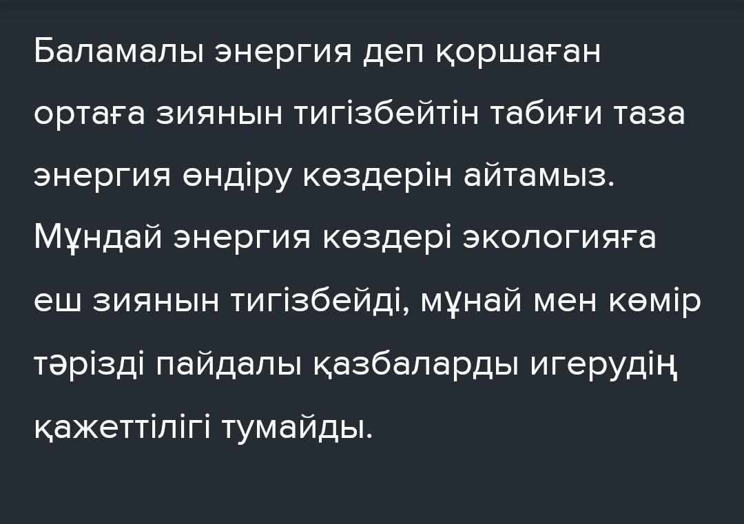 Екі мәтіндегі ақпарат пен өз пікірлеріңізді пайдаланып, «Баламалы энергия көздері адамзат баласының барлық энергетикалық сұраныстарын қамтамасыз ете ала ма?»деген тақырыпта эссе жазыңыз.Эсседегі сөз көлемі 170-200 сөз болуы қажет.