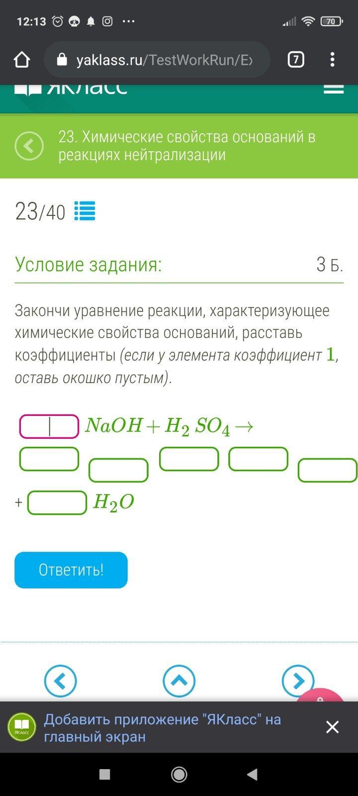 Закончи уравнение реакции, характеризующее химические свойства оснований, расставь коэффициенты (если у элемента коэффициент 1, оставь окошко пустым)