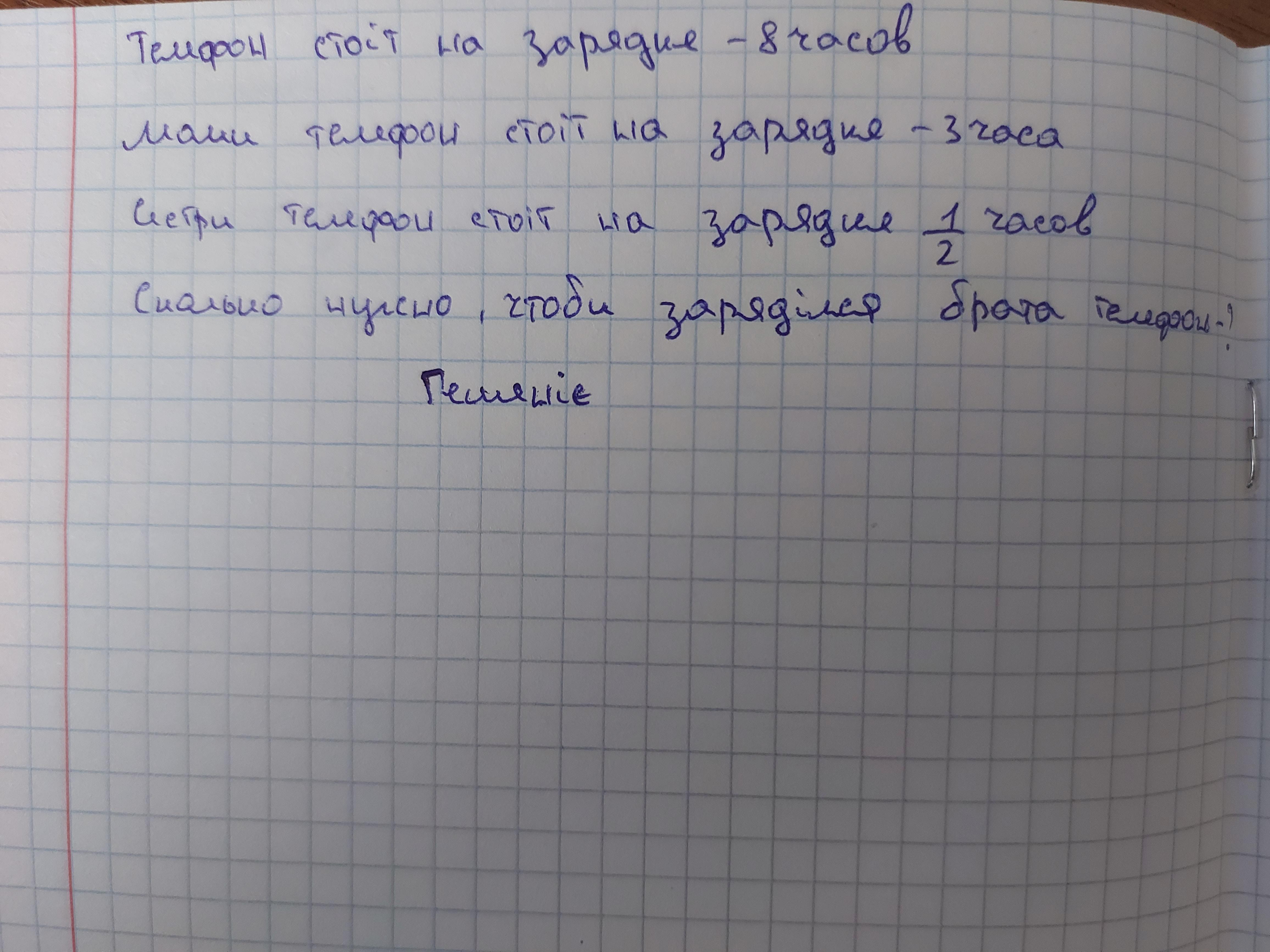 В общем телефон стоит на зарядке 8 часов это 480 минут. У мамы телефон стоит на зарядке 3 часа, значит 180 минут.