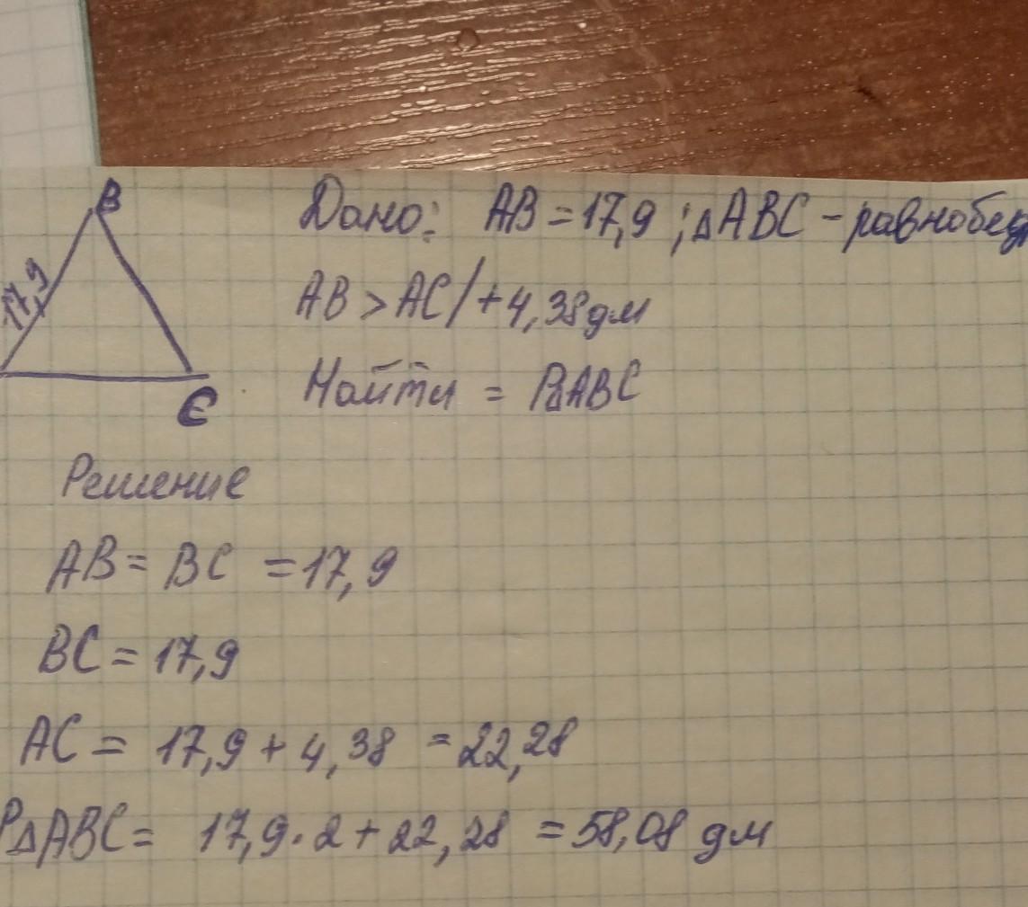 боковая сторона равнобедренного треугольника равна 17,9дм что на 4,38дм больше основания найди периметр этого треугольника.