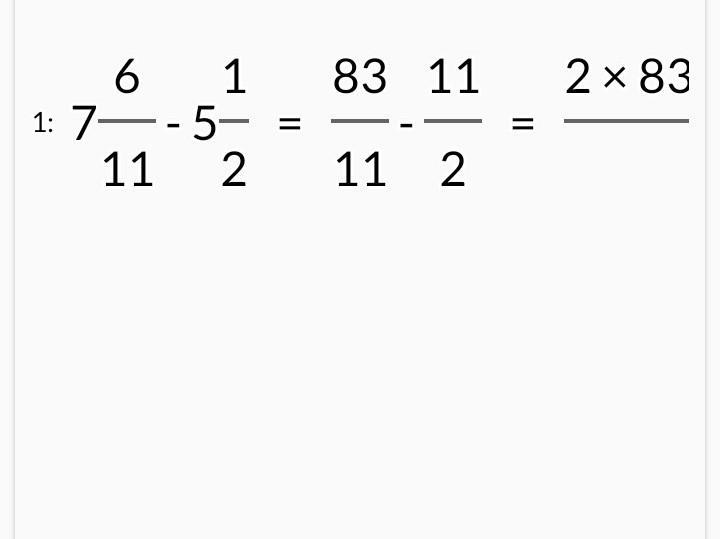 7 6/11 - 5 1/2 = 83/11 - 11/2 = 166/22 - 121/22 = 45/22 = 2 1/22.