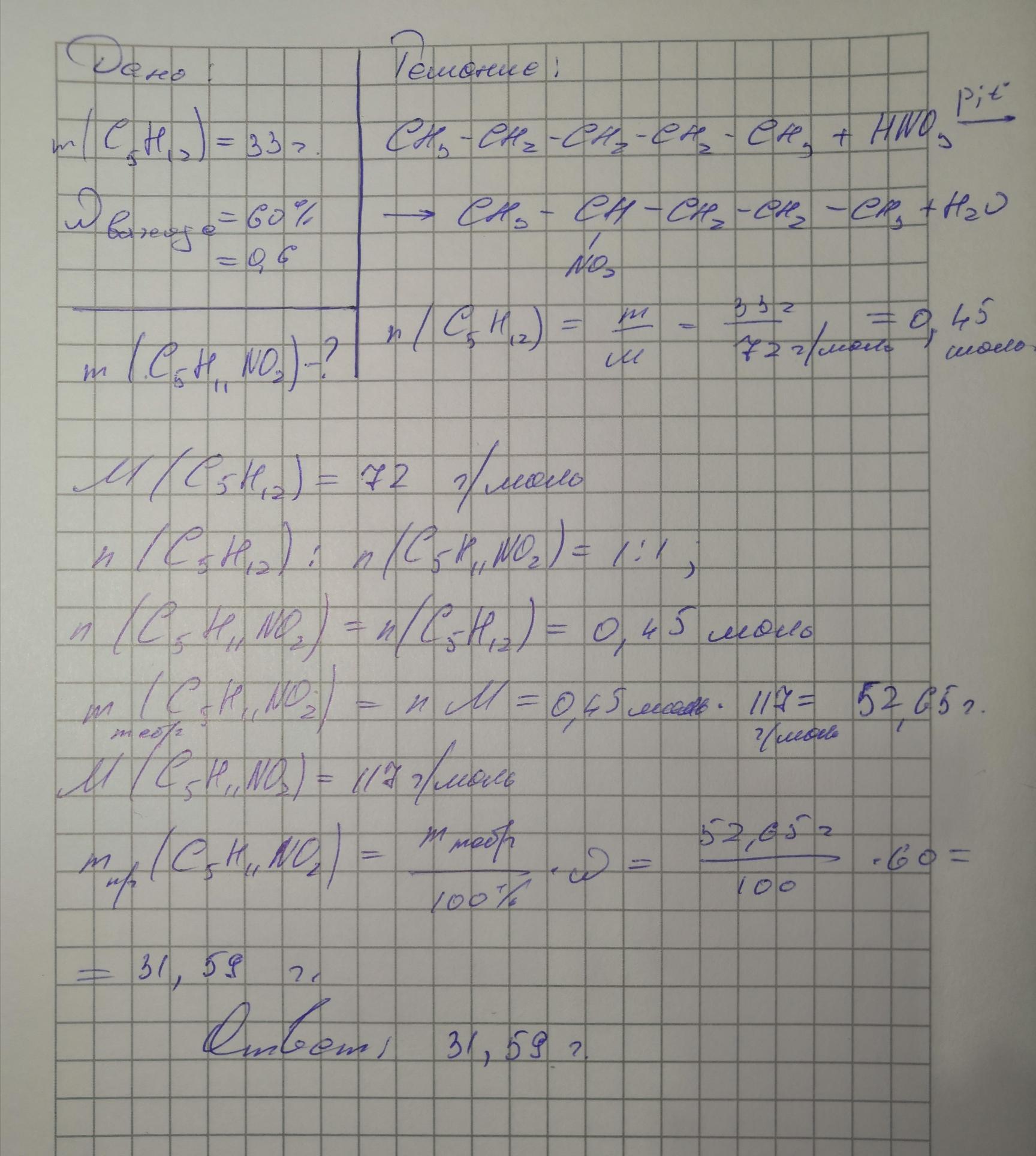 Рассчитать массу нитропентана, который образуется при нитровании 33 г пентана, приняв, что массовая доля выхода реакции составляет 60 %.