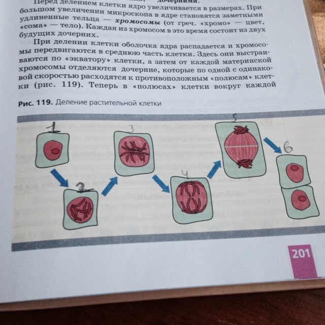1) В ИНТЕРФАЗЕ происходит рост клетки, синтез белков, хромосомы удваиваются. 2)В ПРОФАЗЕ разрушается ядерная оболочка, хромосомы спирализуются, образуется веретено деления. 3) В МЕТАФАЗЕ хромосомы располагаются на экваторе в одной плоскости. 4) В АНАФАЗЕ хромосомы делятся и расходятся к полюсам клетки. 5) В ТЕЛОФАЗЕ разрушаются нити веретена деления, хромосомы деспирализуются и образуется ядерная оболочка вокруг дочерних ядер. 6) ЦИТОКИНЕЗ- разделяется цитоплазма, образуется мембрана вокруг дочерних клеток