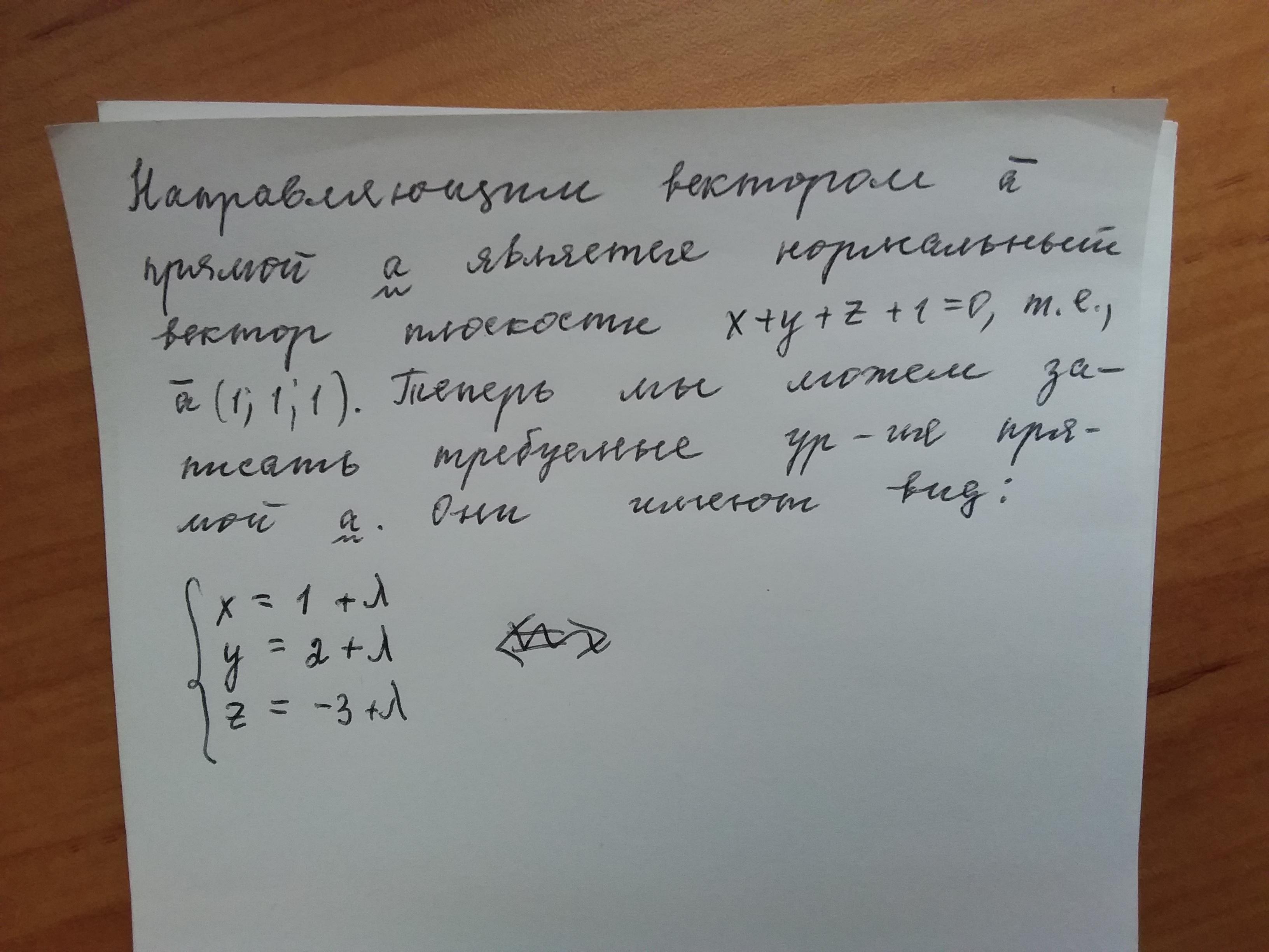 Напишите параметрические уравнения прямой проходящей через точку M (1; 2; -3) и перпендикулярную плоскости x+y+z+1=0 Срочно!!!!!!!!