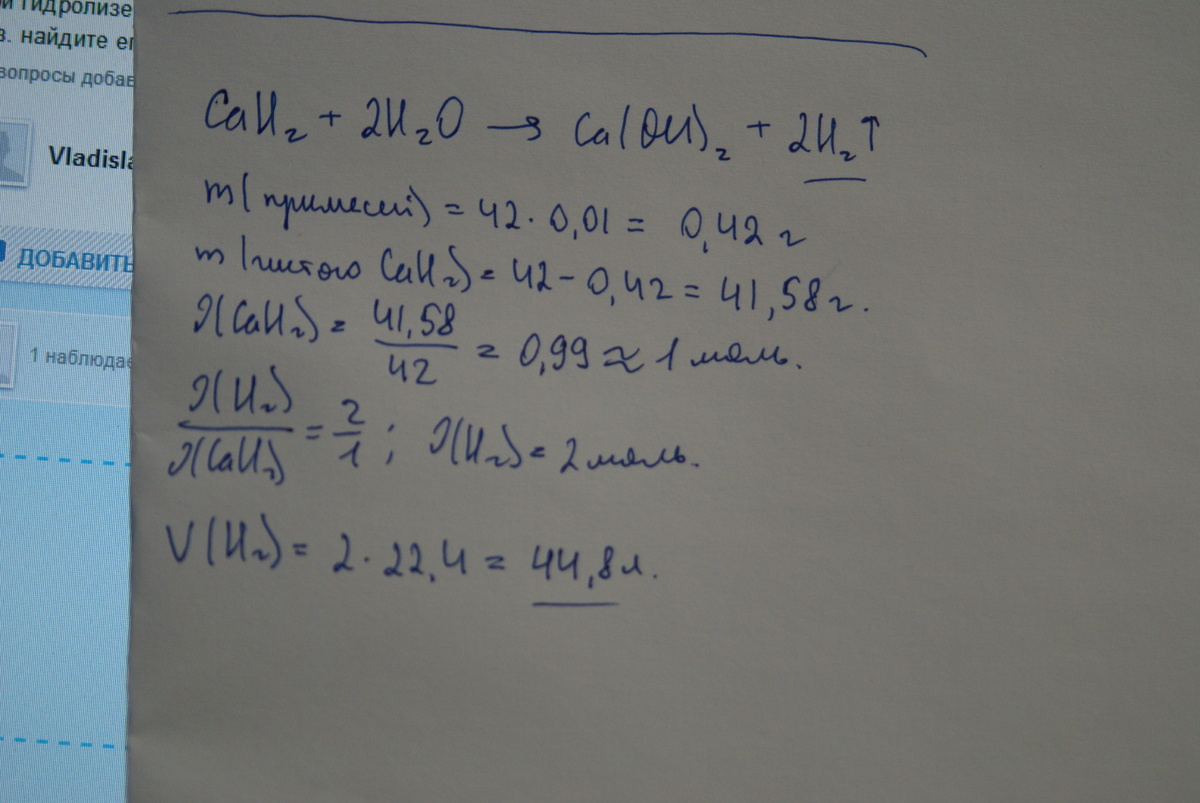 при гидролизе 42 г CaH2 (гидрид кальция) содержащая 1% примисей выделяется газ. найдите его объем. Помогите буду благодарен