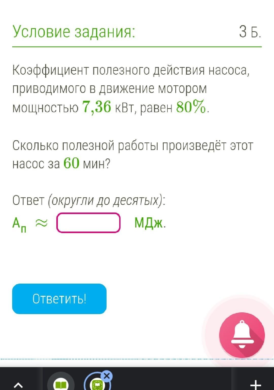 Aп=P*η*t=7360*0,8*60*60=21 196 800 Дж≈21,2 МДж.