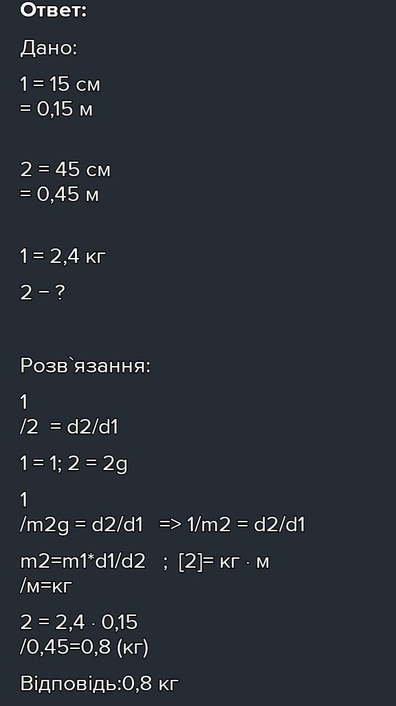 Довжина одного плеча важеля 15 см,а другого-45 см. До меншого плеча важеля прикріпили тіло масою 2,4 кг. Тіло якої маси необхідно прикріпити до більшого плеча, щоб важіль перебував у рівновазі?