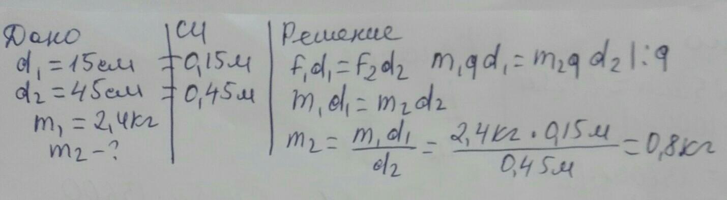 Длина одного плеча рычага 15 см, а второго 45 см. К менее плеча рычага прикрепили тело массой 2,4 кг. Тело которой массы необходимо прикрепить к большему плечу, чтобы рычаг находился в равновесии?