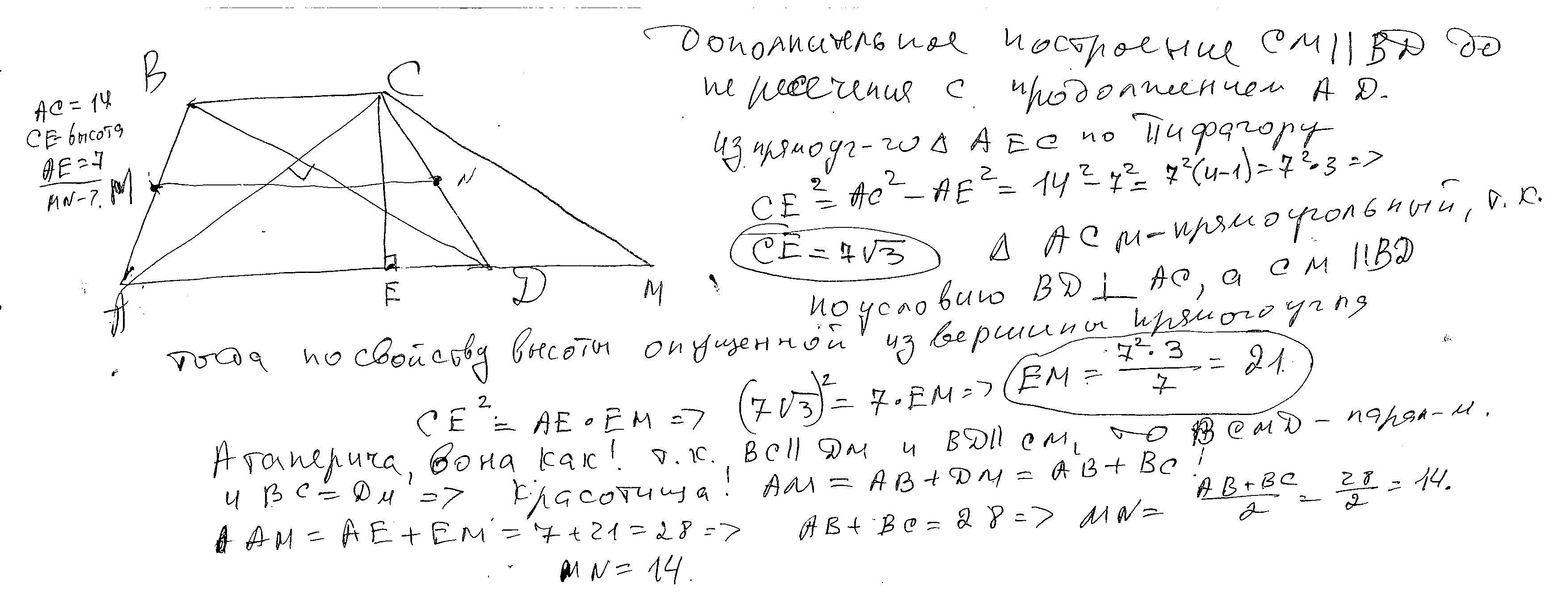 AD і BC основи трапеції ABCD.Діагоналі трапеції взаємно перпендикулярні AC= 14.CE висота трапеції, AE=7 см.Знайдіть середню лінію трапеції