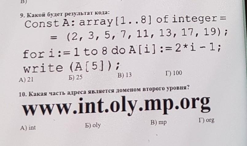 В девятом что-то странное. Массив A - константа, значит в нем нельзя менять значения ячеек, а пятый элемент этого массива - 11. А если и можно менять, то ответ должен быть 9, потому что A[5] = 2 * 5 - 1 = 9