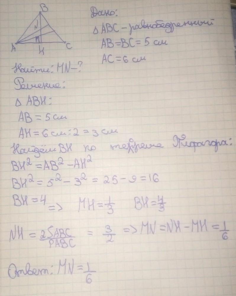 Основание АС равнобедренного треугольника АВС равно 6см, боковая сторона равна 5см. Найдите расстояние между точками пересечения медиан и биссектрис этого треугольника.