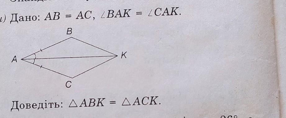 Мы видим что у этих двух треугольниках две стороны равны(АС=АВ, и общая сторона АК)