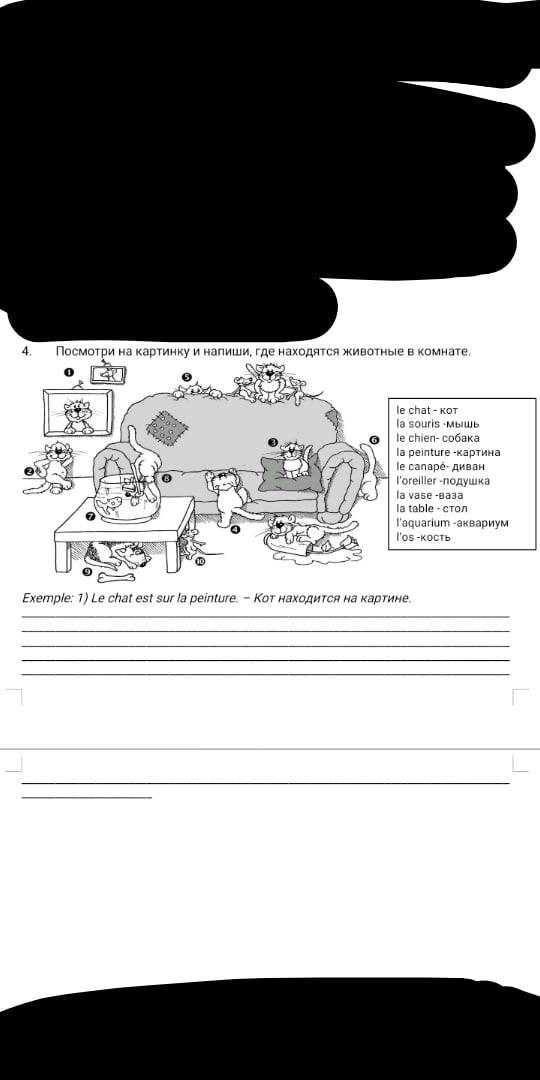 Посмотри на картинку и напиши, где находятся животные в комнате.
