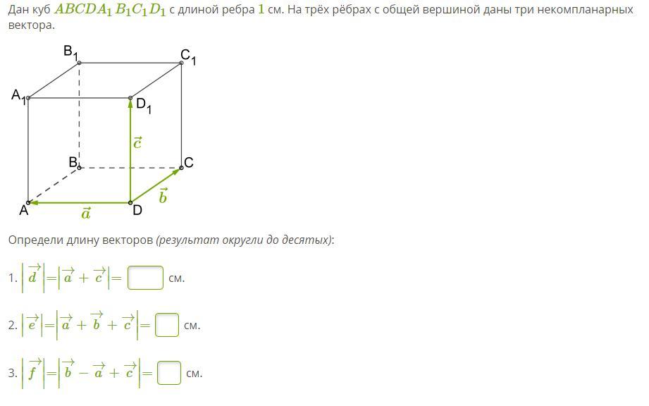 Дан куб ABCDA1B1C1D1 с длиной ребра 1 см. На трёх рёбрах с общей вершиной даны три некомпланарных вектора.