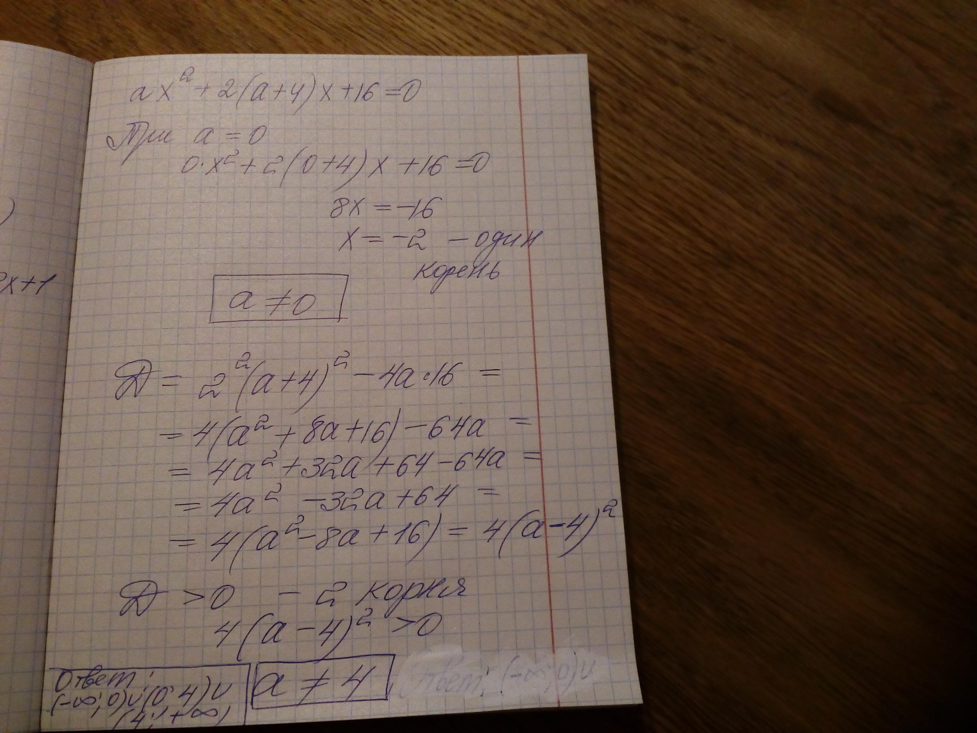 При каких значениях параметра a уравнение ax^2+2(a+4)x+16=0 имеет два различный корня?