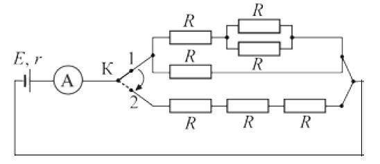 На рисунке изображена схема электрической цепи, состоящей из источника постоянного напряжения с ЭДС 4 В и внутренним сопротивлением 2 Ом,идеального амперметра, одинаковых резисторов с сопротивлением 2 Ом каждый, соединительных проводов и ключа К. В некоторый момент времени ключ переводят из положения 1 в положение 2. Определите отношение показаний амперметра в первом и во втором случае.