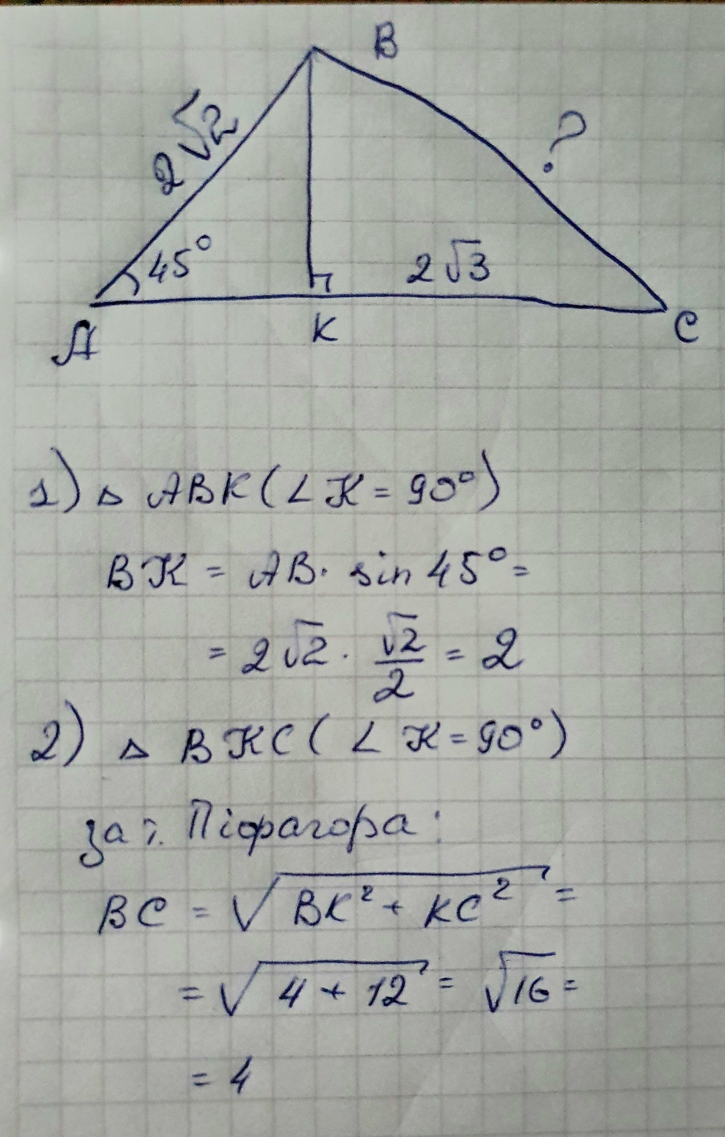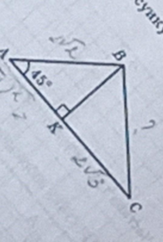 Видризок ВК-висота трикутника АВС, зображеного на рисунку, АВ-2√2 см, КС-2√3 см. Яка довжина стороны ВС и ✓А-45°! тот кто зделает 50 балов пожалуста на сегодня нужно на 8.30 у меня к.р помогите