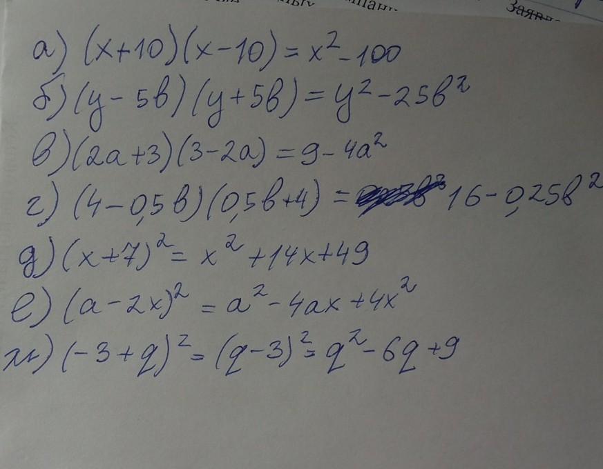 а) (x +10) (x-10); г) (4 — 0,5b) (0,5b +4); ж) (-3 + q)²;